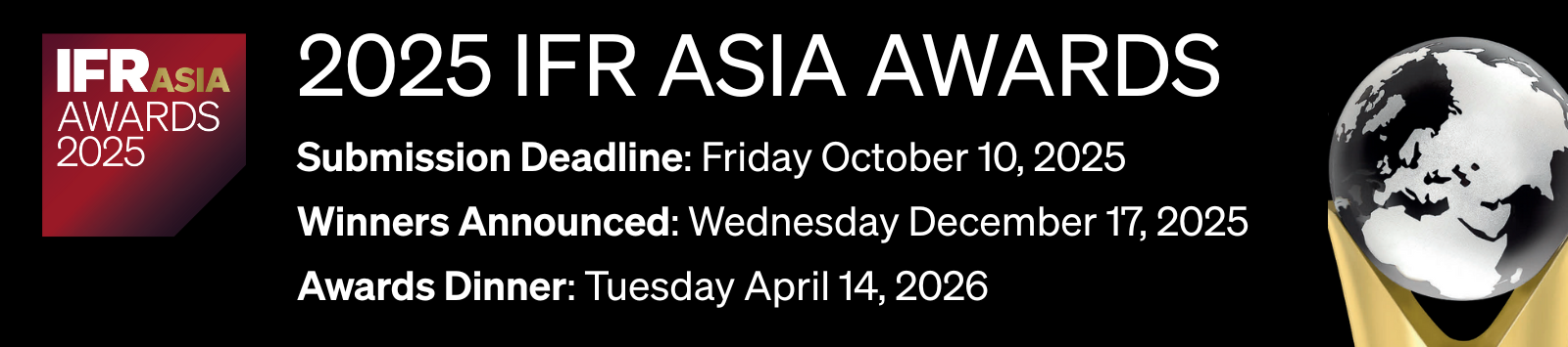 Winners will be announced online on Wednesday December 17, 2025 and in the IFR Asia Awards Supplement published with the weekly magazine on Friday December 19, 2025.