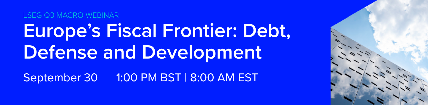 As Europe grapples with economic stagnation, rising defense demands, and evolving global capital flows, the region’s fiscal strategy is under the spotlight. Join LSEG for a timely macroeconomic webinar exploring how European policymakers and markets are responding to these challenges—and what it means for investors.
