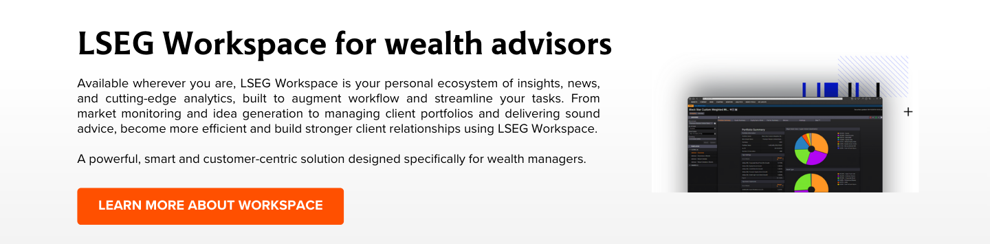 The Advisor Dashboard, which is part of the LSEG Workspace ecosystem and tailored to the Wealth community , brings to life market data and insights relevant to the advisors’ practice, households, or clients. It combines client portfolios with LSEG content, analytics, and visualisation tools to create an enhanced overview – which will shorten response times, increase efficiencies, and ultimately help to grow their business.